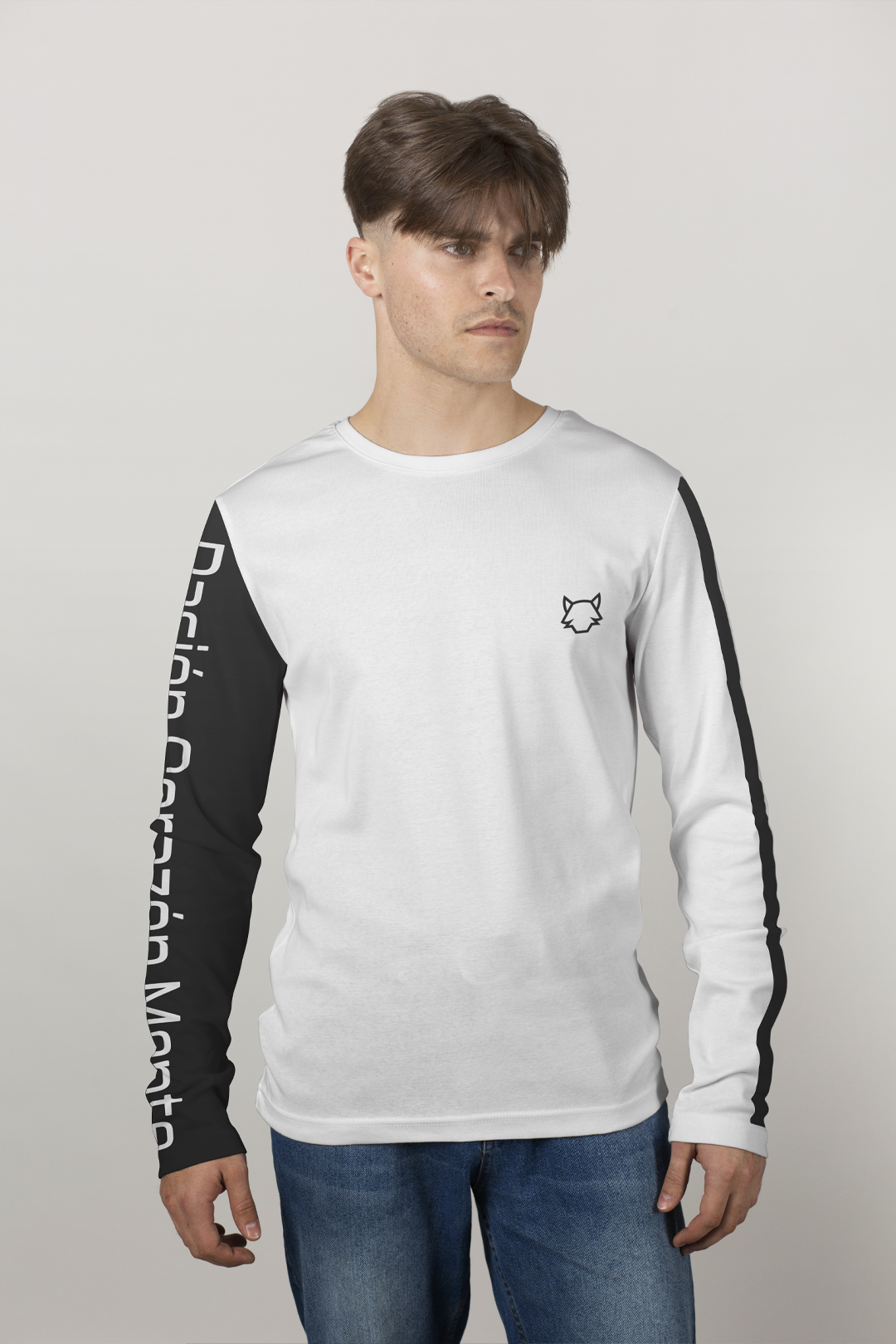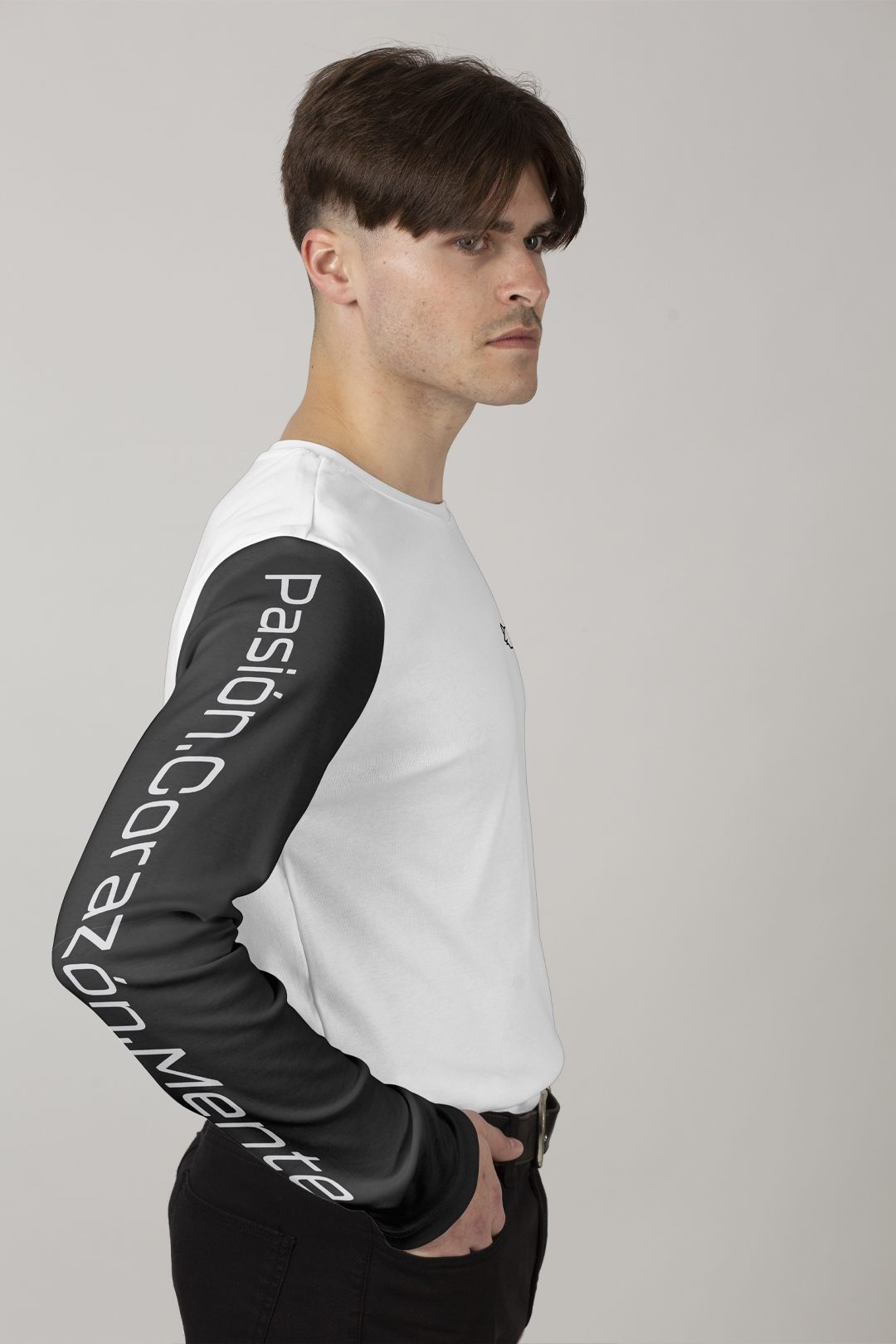 Características: Camiseta de hombre de manga larga, con logo en el pecho y mensaje “Pasión. Corazón. Mente.” en impresión vertical sobre manga izquierda. Diseño bicolor que combina el contraste de manga orcura y cuerpo claro. Ideal para looks urbanos o deportivos con personalidad.
