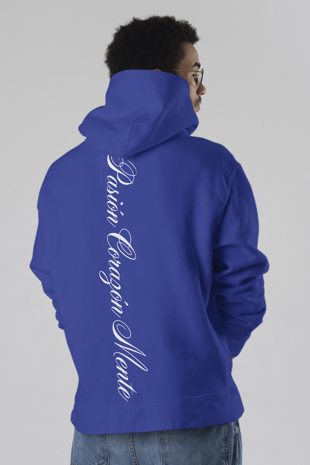 Características: Polerón azul con capucha y bolsillo frontal tipo canguro. Emblema del lobo en el pecho y mensaje caligráfico estampado en espalda tipo Script de Pasión, Corazón y Mente. Estilo urbano con carácter y fuerza visual.