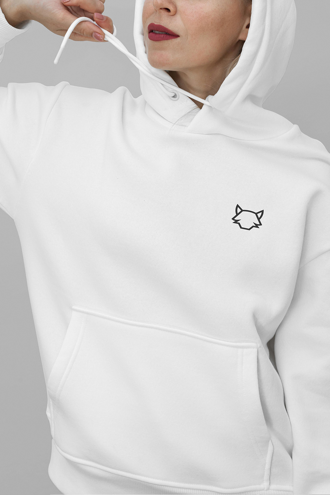 Características: Polerón blanco de mujer con logo del lobo en el pecho y estampado vertical en la espalda que combina la marca PCM con el emblema del lobo. Diseño que fusiona sencillez y elegancia, ideal para quienes buscan destacar con un estilo auténtico y decidido.