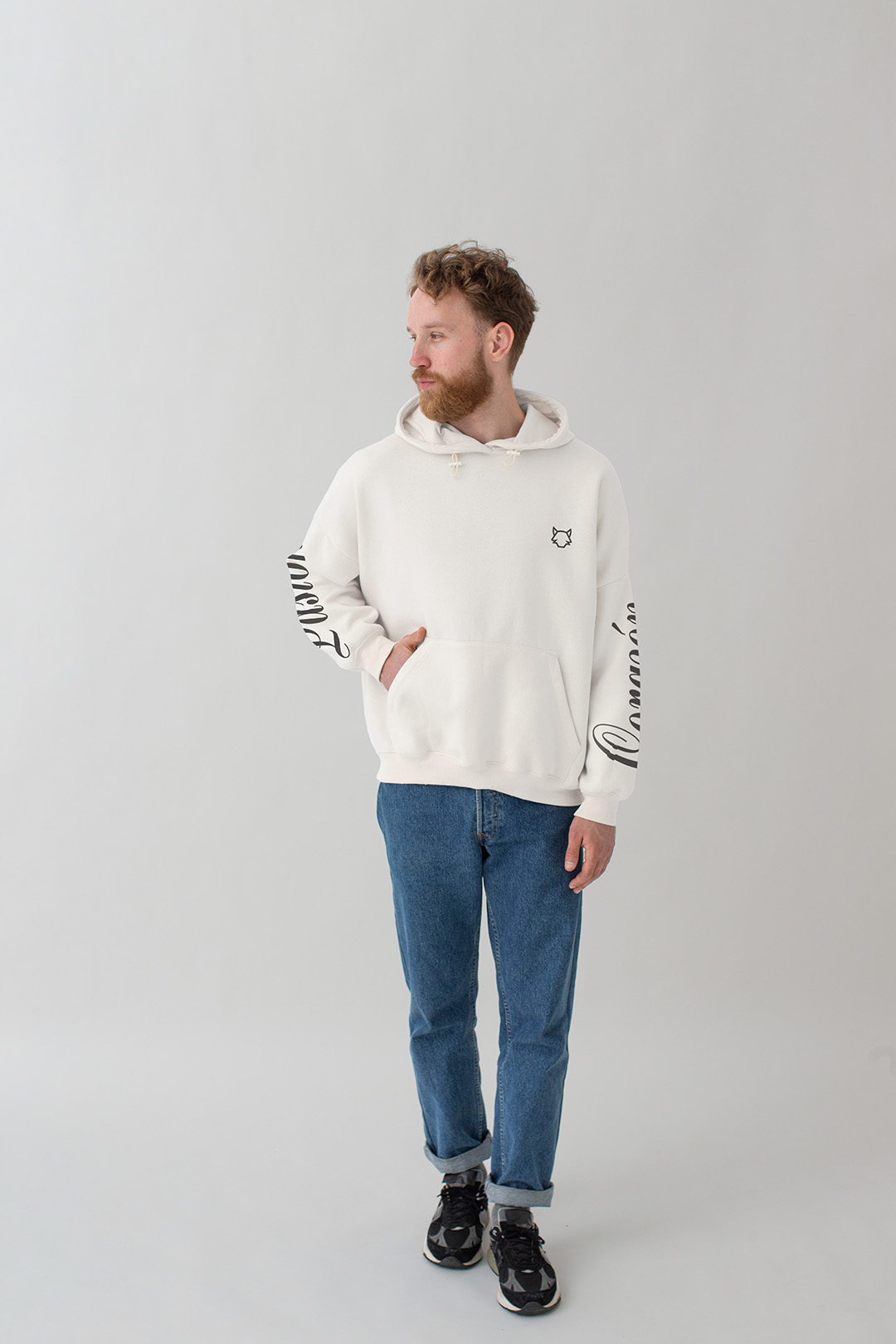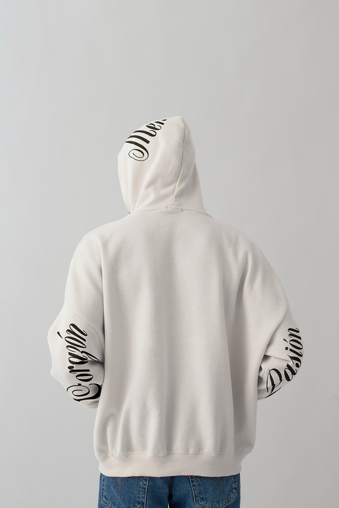 Características: Polerón blanco con capucha y bolsillo frontal tipo canguro. Emblema del lobo en el pecho y mensaje caligráfico estampado en ambas mangas y capucha de Pasión, Corazón y Mente. Estilo urbano con carácter y fuerza visual.