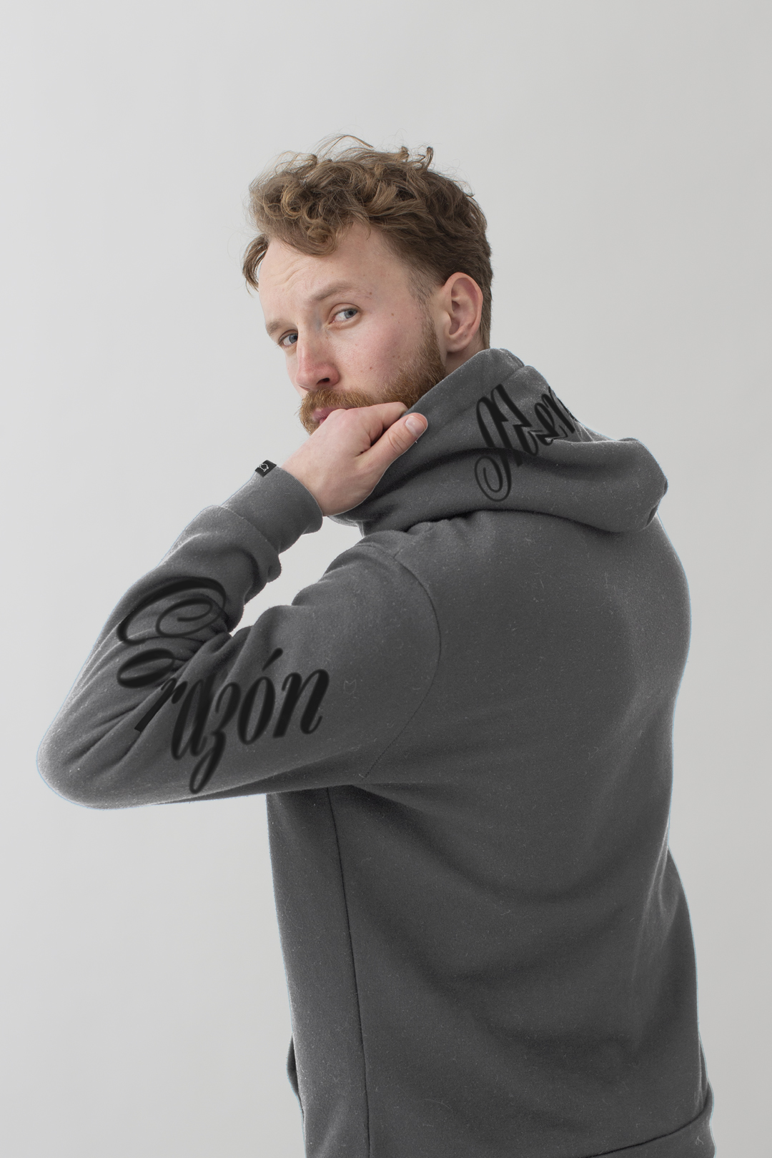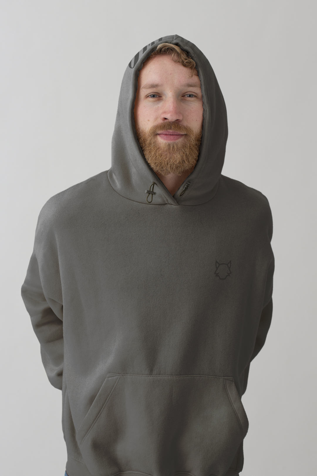 Características: Polerón gris con capucha y bolsillo frontal tipo canguro. Emblema del lobo en el pecho y mensaje caligráfico estampado en ambas mangas y capucha de Pasión, Corazón y Mente. Estilo urbano con carácter y fuerza visual.