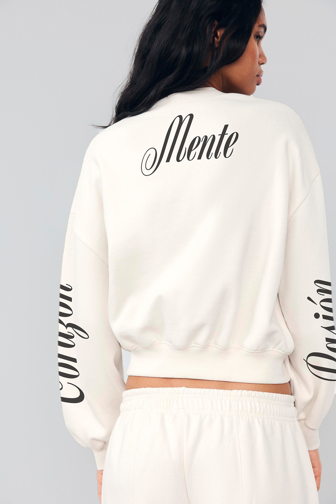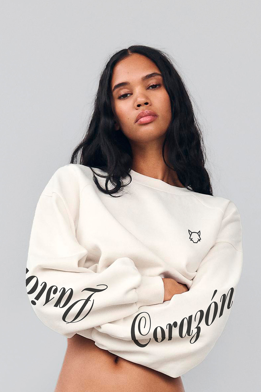 Características: Polerón blanco de mujer tipo Crop con emblema del lobo en el pecho y mensaje caligráfico estampado en ambas mangas y espalda de Pasión, Corazón y Mente. Estilo urbano con carácter.