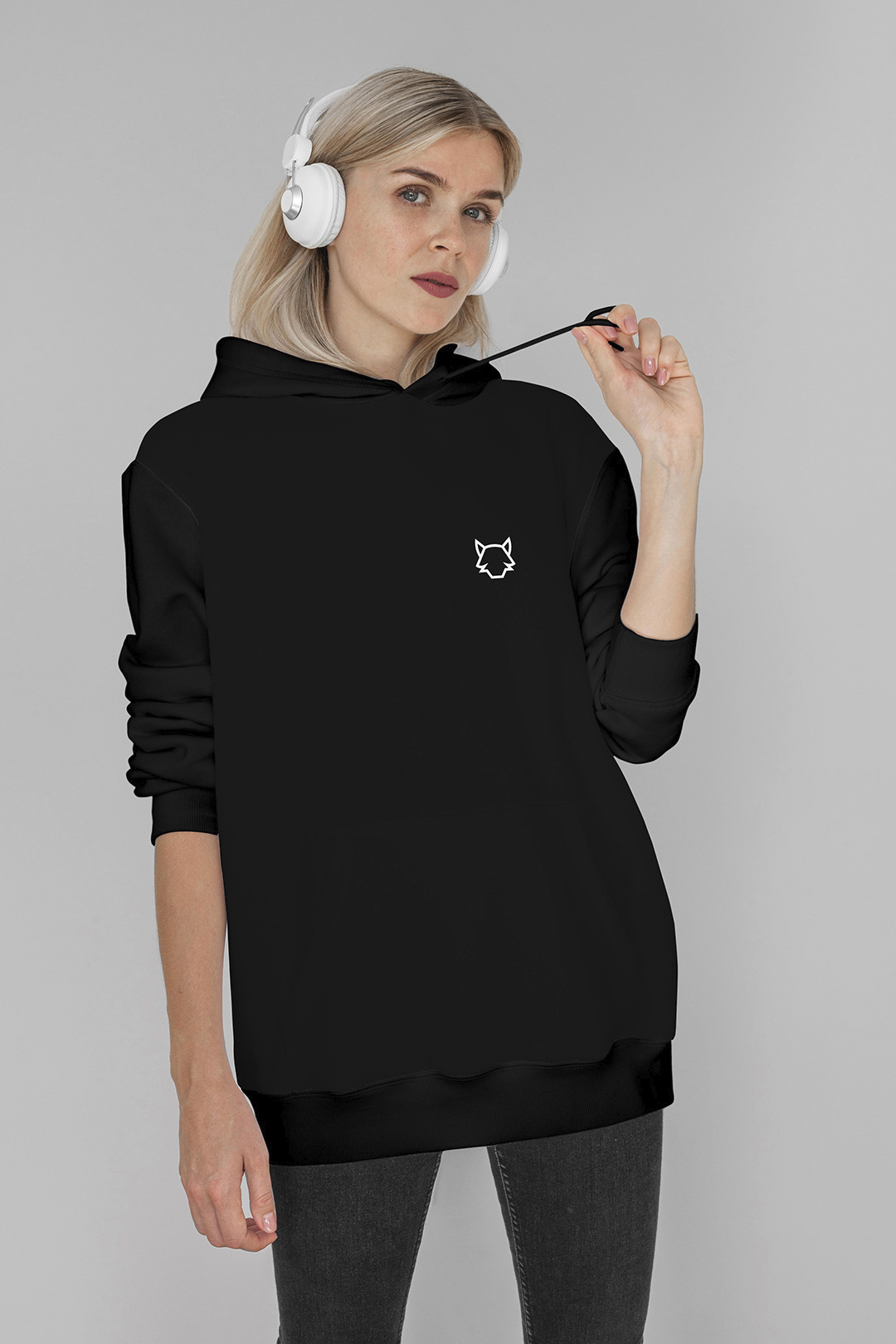 Características: Polerón negro de mujer con logo del lobo en el pecho y estampado vertical en la espalda que combina la marca PCM con el emblema del lobo. Diseño que fusiona sencillez y elegancia, ideal para quienes buscan destacar con un estilo auténtico y decidido.
